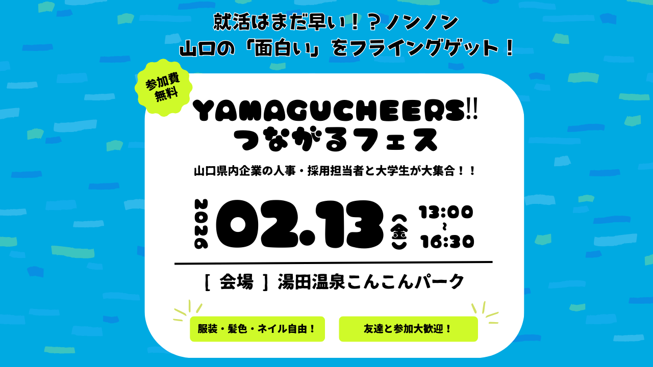 #お知らせ#学生 YAMAGUCHEERS!!では、2026年2月13日(土)に湯田温泉こんこんパークにて、企業50社・学生100名が参加する大規模交流イベントを開催します。企業と学生の共創をテーマに、今回は「就活の一歩を踏み出す」をテーマに様々なコンテンツを準備しています。